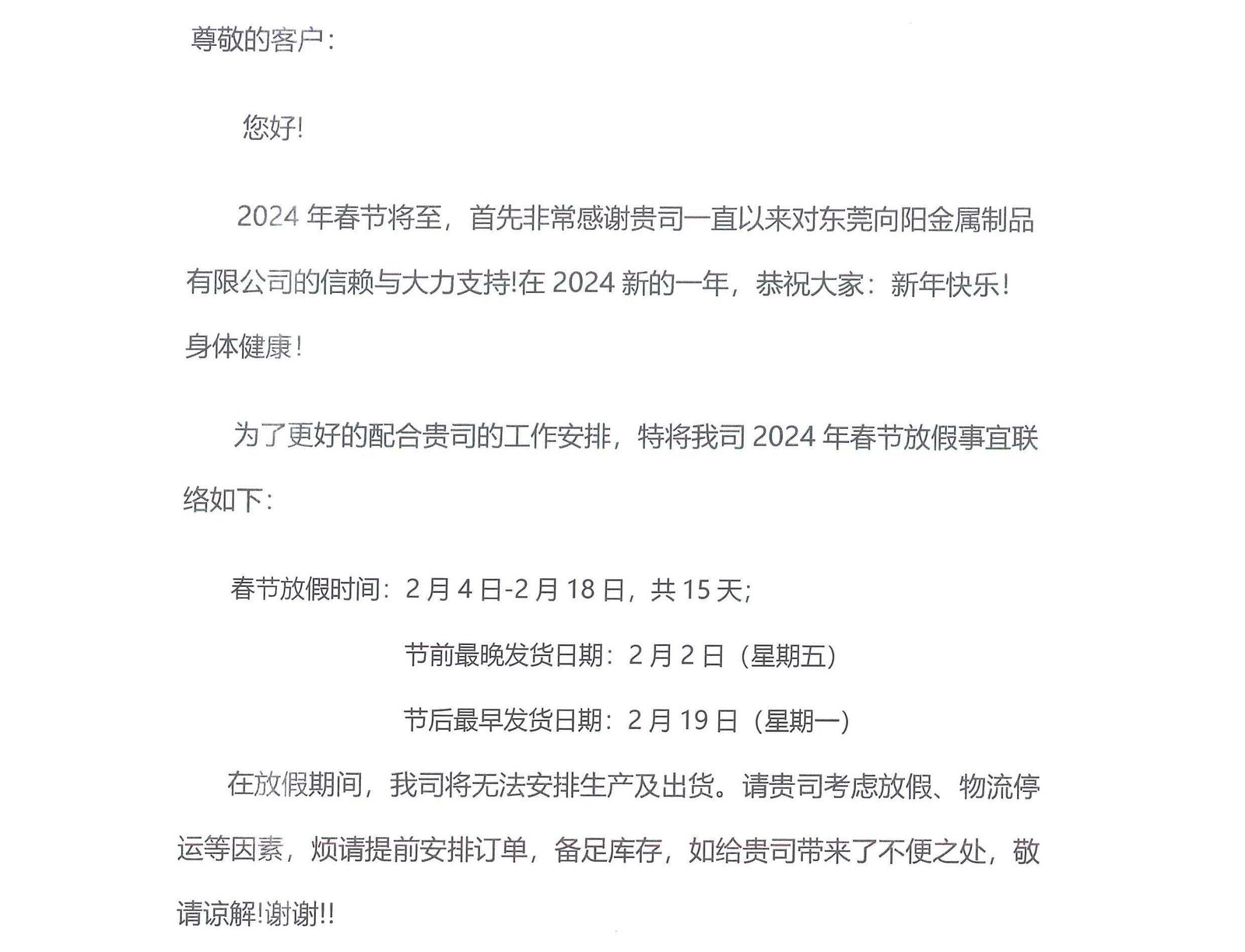 各尊敬的客户,以下是2024年我司春节的放假安排,如有各种事项请提前联系,感谢支持!